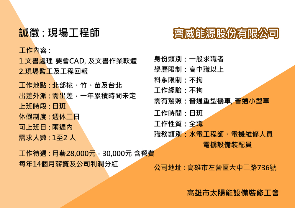 職務類別:水電工程師、電機維修人員