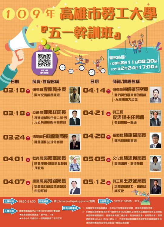 109年高雄市勞工大學「五一幹訓班」開始報名嘍!!~