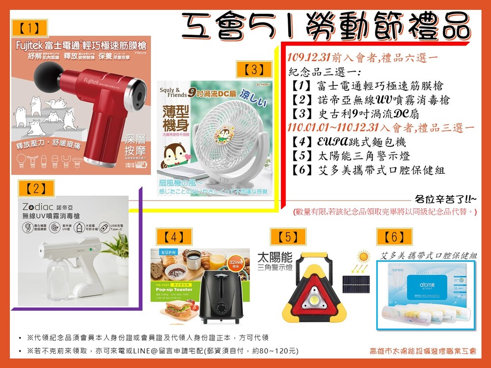 一、111年五一勞動節紀念品發放,凡於109年12月底前入會,且截止111年05月仍為會員者,請於111年05月01日起至05月31日止,本人攜身份證或會員證至工會領取紀念品壹份。【逾期視同放棄】