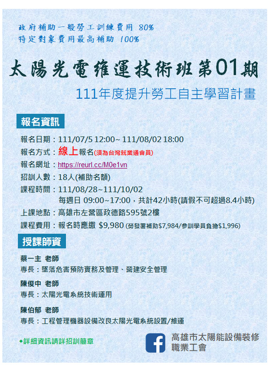 【在職者限定】111太陽光電維運技術班第1期開始招生了~