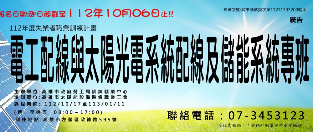 最後一波~電工配線與太陽光電系統配線及儲能系統專班報名截止:112.10.06止