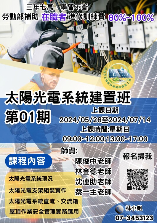 太陽光電系統建置班第01期 報名日期:05/14 12:00