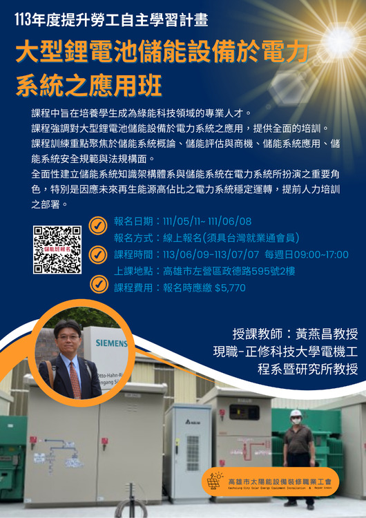 本課程提供了學生豐富的技能:1.研究不同種類的儲能技術,如電池、超級電容、抽蓄水能等,2.儲能系統安全規範,3.儲能系統建置與維運。 本課程將為學生提供大型鋰電池儲能設備於電力系統之應用技能。 |